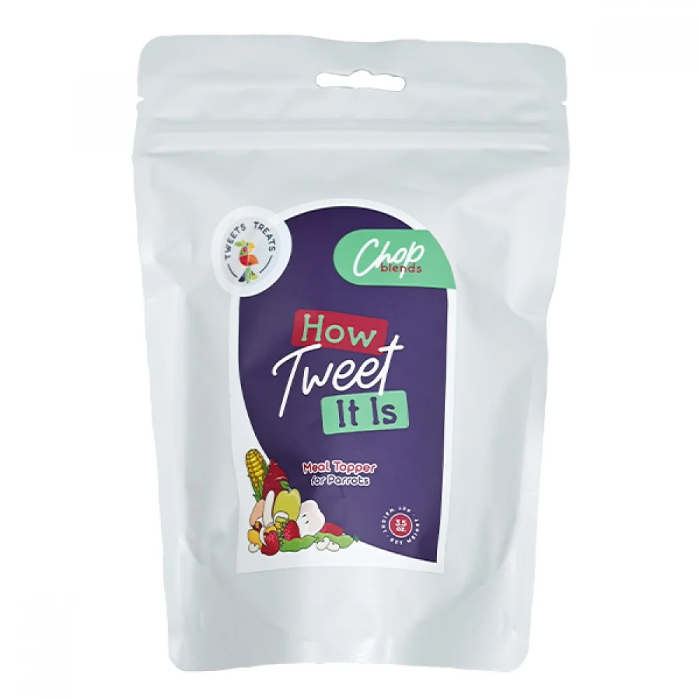 Tweets Treats – “Bird Tested, Bird Approved”. Elevate your feathered friend’s diet with one of our Tweets Treats brand products How Tweet It Is  blend , a convenient and nutritious blend of freeze-dried fruit and vegetables selection.